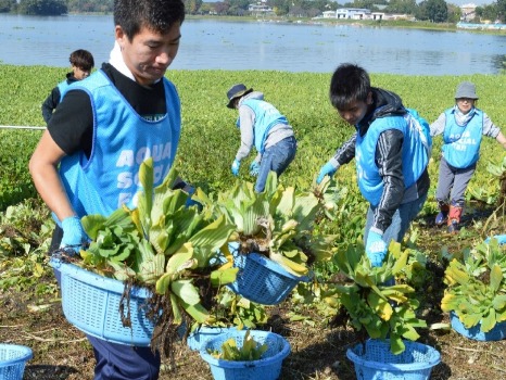 江津湖は、熊本県民、特に熊本市民にとってイメージしやすい水辺の風景であり、周辺の公園や施設などは憩いの場となっています。この湖は豊富な湧水のおかげで年間通して18度程度の水温を保っており、その結果、ウォーターレタス等の外来種植物の繁茂を招いています。この影響で、湖畔の風景が一変しただけでなく、スイゼンジノリをはじめ江津湖本来の植物生態系は大きな影響を受け、社会的にも問題となっています。