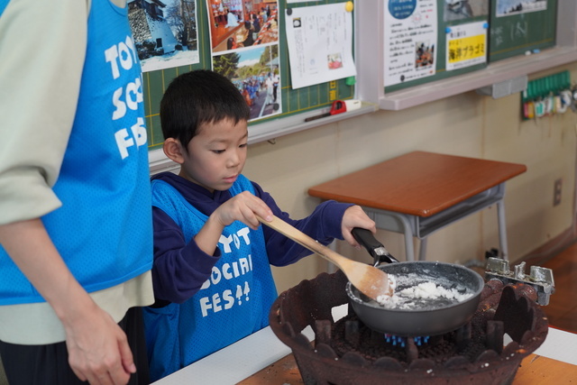 環境への意識を高めた後は、流木アート、レジンアクセサリーづくり、塩づくり、エコキャップアートの4つの体験に分かれてSDGsの活動に挑戦しました。塩づくり体験では、波松区長・坂井優さんが海水からどれくらい塩が採れるかクイズを出題。子どもたちは、火にかけた海水を木ベラで混ぜて実際に塩を作り、答えを確かめていました。また、漂着ゴミの影響で、きれいな海水をくめる場所が減っていることも学び、海の環境を守る大切さを実感しました。出来た天然塩は、新鮮な野菜に付けて試食。「まろやかな塩味で美味しい」という声が飛び交っていました。