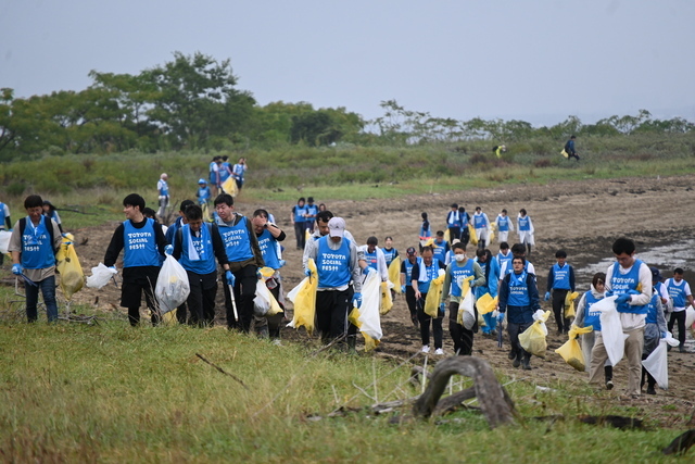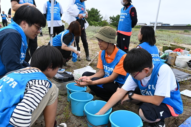 松阪市にある松名瀬干潟は、海に近い前浜干潟、陸に近い潟湖干潟、河口にある河口干潟がそろう貴重な干潟で、さまざまな生物が生息しています。しかし、近年漂着ゴミや不法投棄などにより豊かな生態系が脅かされつつあります。TOYOTA SOCIAL FES!!では、松名瀬干潟を学び守るため、環境学習と海岸清掃を行いました。
