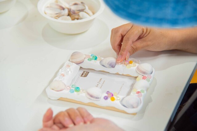 清掃活動の部では、ゴミ袋を手にした参加者が干潟へ。一見干潟にはゴミは見えないのですが、よく見ると小さなプラスチック片や空き缶などが散見。さらに泥の中から瓶やペットボトルを見つけ、それらを一つ一つ丁寧に拾っていきます。天候の良い日は有明海の対岸に雲仙普賢岳まで見渡すこともできる荒尾干潟。この日はあいにくの曇り空でしたが、初めて荒尾干潟を訪れたという参加者はその雄大な景色に感激していました。ワークショップの部では、熊本県立大学のボランティアサークル「Maple Leaves」の協力を得て、貝殻を使ったフォトフレームを作成。参加者同士で話し合いながら、貝殻と色とりどりのビーズを組み合わせて個性豊かな作品づくりに没頭していました。