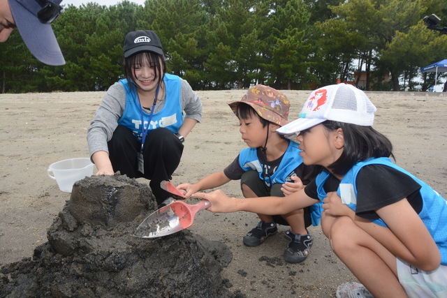 重富海岸は2012年、霧島錦江湾国立公園に加わった豊かな海の生き物の宝庫です。干潮時には約53ヘクタールと湾内最大の干潟が姿を現します。海と陸をつなぐ干潟には300種以上の生物が生息し、魚や鳥のえさ場でもある「うみのゆりかご」として、海の水質浄化や生物多様性を支えています。この日はNPO法人「くすの木自然館」の浜本麦さん指導のもと、砂山作り「掘って運んで積み上げろ!」やバケツに海水をくんで大きなバケツにいるアヒルの人形を救出する「バケツリレー」などに挑戦しました。イベント開始時は松林の近くだった波打ち際が潮が引いてどんどん遠くなる中、子どもたちは持ち前のパワーを発揮。はね上げた泥が顔に付いたり、ぬかるみに足を取られたりしながらも、懸命に干潟を走り回りました。最後に漂流物などのゴミを拾って回り、干潟の環境保全に一役買いました。