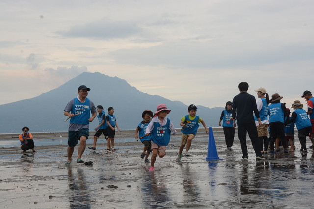 「TOYOTA SOCIAL FES 鹿児島」は、鹿児島県の美しい自然を守る活動に取り組んでいます。今年は10月に姶良市の重富海岸で「干潟の大運動会」を開きました。参加した約80人は干潟で泥だらけになりながら、競技やゴミ拾いなどを通じて、多様な生き物を育む錦江湾やSDGs(持続可能な開発目標)について学びました。