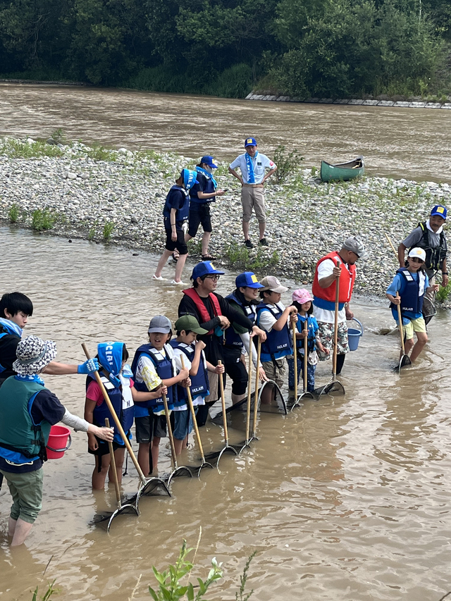 午前は河川敷の清掃からスタート。日頃の地域活動の成果か、落ちていたゴミはごくわずかで、「少なくて驚いた」「普段からきれいに保たれている証拠」との声も聞かれました。清掃後は、魚や水生生物の採取・観察を実施。網で魚やエビを捕まえ、種類や特徴を学びます。中には、きれいな川にしか生息できない生物もいて、参加者は感心しきり。さらに水質調査も行い、透明度や水温、pHなどを計測しながら川の環境を守ることの大切さを実感しました。