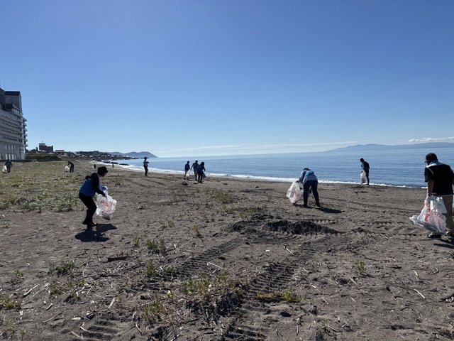 地元在住者を中心に116名が参加し、海岸や温泉街は、青いビブスを着たボランティアで埋め尽くされました。火ばさみとゴミ袋を手に、班ごとに分かれて散乱したゴミを一つひとつ拾い集めます。花火大会翌日の街にはたばこの吸い殻やビン、花火の残骸などが散乱。拾い集めた大小様々なゴミの量は1時間ほどで45ℓの袋100袋分になりました。
