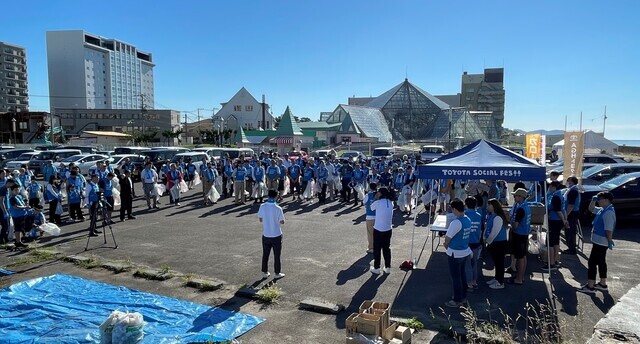地元の恒例行事「湯の川温泉花火大会」は、毎年多くの観光客や市民を楽しませてくれる夏の風物詩です。しかし終了後の会場には、飲食物の容器やペットボトルなどが散乱。これまで湯の川温泉旅館協同組合が中心となって清掃を続けてきましたが、人手不足が課題でした。約10年前からTOYOTA SOCIAL FES!!がこの活動に参加し、作業人数は倍増。地域に欠かせない取り組みとして継続されています。今年も花火大会翌日の8月24日、晴天のもと多くの参加者が集まり、夏の陽気に負けない熱気に包まれながら活動がスタートしました。