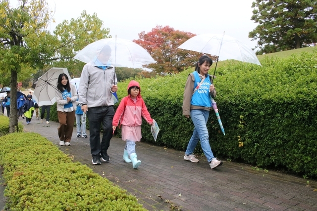 この日は、あいにくの雨模様でしたが、約80人が木場潟公園に集まりました。開会式後、まずフォトウォークラリーが行われました。六つのコースが用意され、各グループがチェックシートに記された石碑や遊具、施設にある撮影場所を探しました。集合場所に戻ってくると、子どもたちは「全部、見つけた!」と誇らしげにチェックシートを見せてくれました。短い時間でありながらも、園内の散策を満喫しました。