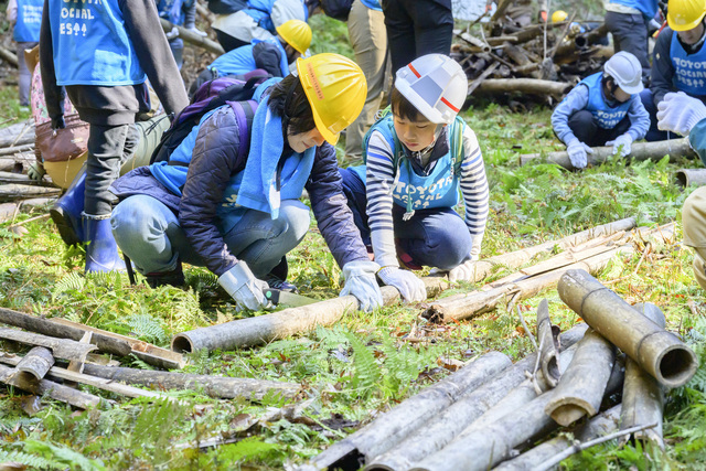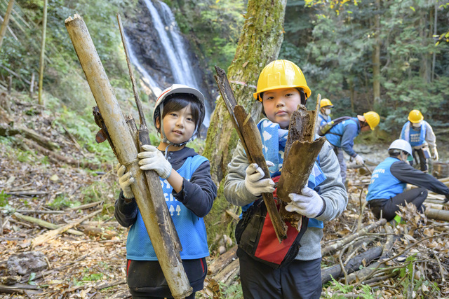 同地区では寿命や積雪で倒れた竹が散乱。高齢化で整備が追いつかず、荒れた竹林が点在しています。倒竹は植物の成長を妨げ、生態系の乱れやイノシシなど獣による農作物被害にもつながります。参加者たちはヘルメットをかぶり、山道を約400メートル下って聖ケ滝周辺の約20アールの竹林へ。倒竹を運び出し、加工しやすいよう1メートルほどにのこぎりで切り分けていきました。「太い竹を切ると達成感がある」「林が明るくなっていくのがうれしい」と笑顔で約1時間作業し、約250キロの竹を処理しました。