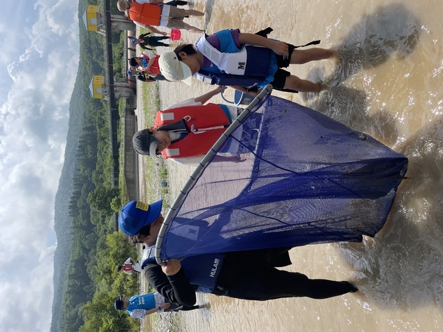 午前は河川敷の清掃からスタート。日頃の地域活動の成果か、落ちていたゴミはごくわずかで、「少なくて驚いた」「普段からきれいに保たれている証拠」との声も聞かれました。清掃後は、魚や水生生物の採取・観察を実施。網で魚やエビを捕まえ、種類や特徴を学びます。中には、きれいな川にしか生息できない生物もいて、参加者は感心しきり。さらに水質調査も行い、透明度や水温、pHなどを計測しながら川の環境を守ることの大切さを実感しました。