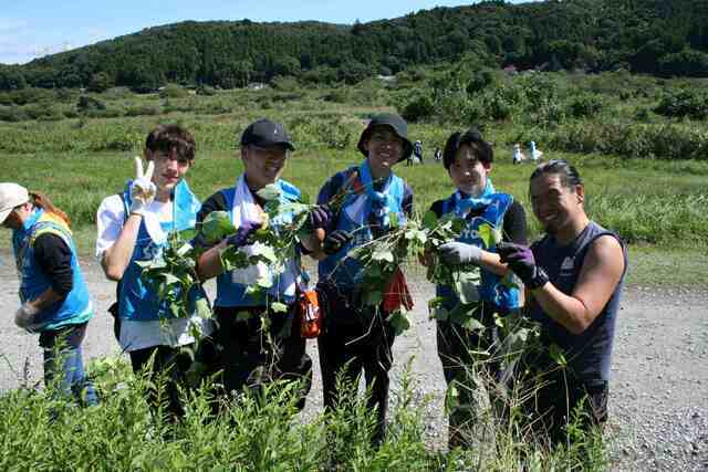座学を終えた参加者たちは、同園東側の那珂川河川敷で、クリーンアップ活動をスタート。ゴミ拾い班と、外来植物のアレチウリ駆除の班に分かれました。河川敷では、家族連れや友達同士などで、慣れない河原の石に足を取られ、草を掻き分けながらも、ペットボトルや空き缶などを拾っていました。また生い茂っていたアレチウリの駆除が進むと、見る見る土手がきれいになっていきました。