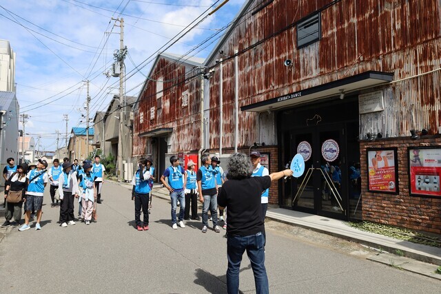 清掃活動のあとはNPO法人アクア・チッタによる万代ふ頭の活性化事業についての講演とガイドツアーが開催されました。以前は使われなくなった倉庫が建ち並び、不法投棄されたゴミなどが溢れていた万代ふ頭。地域の人々の再開発活動で今日では複数の飲食店やショップが店を構え、イベントを行えば多くの人が訪れる、徳島を代表するスポットのひとつとなっています。グループで参加していた大学生は「清掃活動をしながらまちを知ることが出来るプログラムに魅力を感じ参加しました。大学では建築を学んでいて、建築物を設計する際にも緑を多く取り入れるなど環境を意識することがあります。」と話しました。