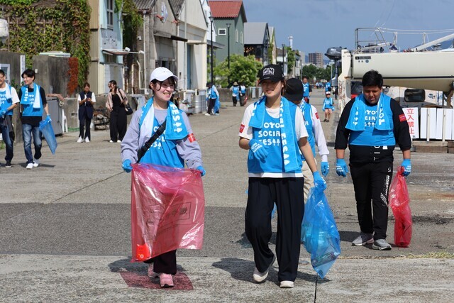 秋風が涼しく感じられる気候となりましたが強い日差しが照りつける晴天の日。十分な暑さ対策をしながらイベントがスタートし、参加者はゴミ袋を手にしながら広い倉庫街を散策するようにゴミを集めます。美しく整った街並みにゴミは見つからないかと思いきや、川に近い場所ではたくさんのプラスチックゴミを発見。ゴミ袋40袋分を収集する成果となりました。