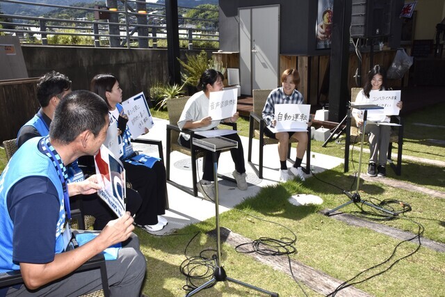 体験会の後はトークセッション。愛媛大学社会共創学部の槙林啓介准教授が「かつて砥部焼の原料の陶石は水車で粉にし、窯の燃料はアカマツを使っていた。採石から生産、出荷まで砥部で完結しており、自然との共生生活を営んでいた」と解説しました。また、トヨタ販売店の社員3人と同学部の学生3人によるクロストークがあり、「エコなこと」の実践で、学生の1人は「一生使うつもりで物を大切にしたい」と回答していました。参加した東温市の小倉和代さん(56)は「フードロスをなくすなど、これからも環境に配慮した生活を送りたい」と話していました。